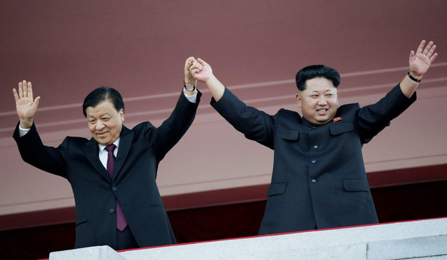 Ủy viên thường vụ Bộ chính trị Trung Quốc Lưu Vân Sơn (trái) cùng lãnh đạo Triều Tiên Kim Jong Un dự lễ duyệt binh ở Bình Nhưỡng ngày 10/10, bước đầu cải thiện quan hệ Trung-Triều. Ảnh: AP