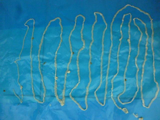 Sau khi là chủ nhân của con sán khủng nhiều năm, anh Đông lắc đầu lè lưỡi xin cạch những món tái sống.Con sán dây bò dài 12 mét trong bụng anh Đông. Ảnh tư liệu bác sĩ cung cấp.