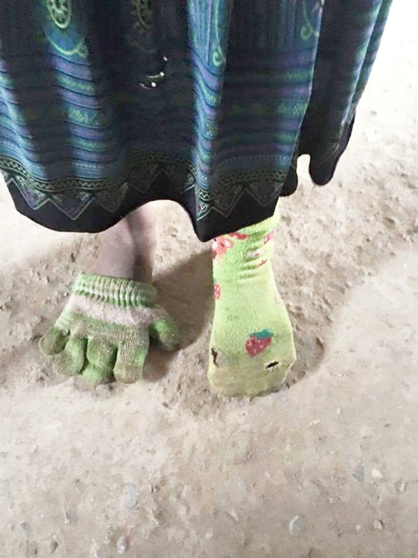 Giữa trời đông giá buốt, hình ảnh một bé gái 1 chân đi tất rách, 1 chân xỏ chiếc găng tay đã lay động lòng người. Chiếc tất đã rách vài chỗ, chiếc găng tay nhỏ xíu tới mức chỉ vừa cho nửa bàn chân của cô bé khiến nửa kia tím lại vì lạnh. Quá xót xa phải không bạn?