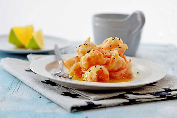 Gắp tôm đã ráo dầu ra đĩa, rưới nước sốt cam bơ lên, trên cùng rắc ít vừng đen đã rang thơm.