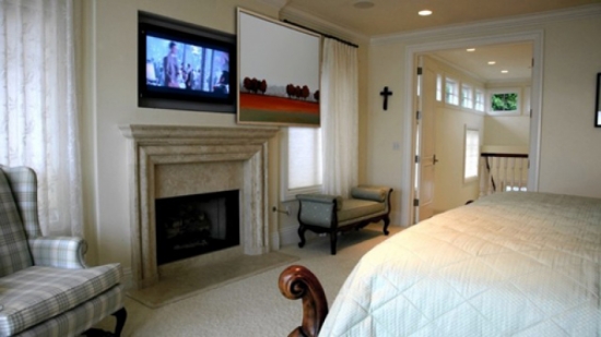 Thiết kế dùng tranh che tivi khi không dùng đến là ý tưởng tuyệt vời cho phòng ngủ của gia đình. Ảnh sưu tầm