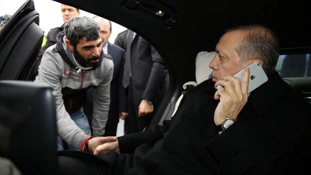 Khi cửa xe mở ra, quả thực Tổng thống Erdogan đang ngồi bên trong và trả lời điện thoại. Có vẻ như ông Erdogan đã an ủi người đàn ông điều gì đó, nên sau đó anh ta đã hôn lên tay ông và rời đi.