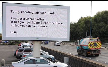 Không la hét om sòm hay thượng cẳng chân hạ cẳng tay, cô vợ có tên Lisa sống tại Sheffield (Anh) chọn cách bêu riếu chồng rất độc khi móc túi hàng trăm bảng mua pano quảng cáo trưng thông điệp gửi đến chồng và nhân tình trên cung đường anh ta vẫn đi làm.
