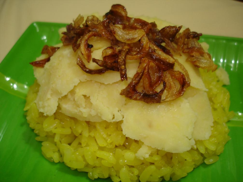 - Nếp chín, đổ ra mâm sạch, cùng với đỗ xanh đã giã.