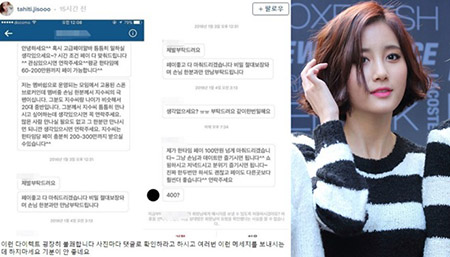 Sự việc xảy ra với nữ ca sĩ Jisoo. Cô đã bị người hâm mộ liên tiếp nhắn tin với nội dung không lành mạnh. Công ty quản lý Tahiti khẳng định sẽ nhờ pháp luật can thiệp để bảo vệ danh dự cho thành viên này.
