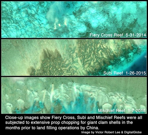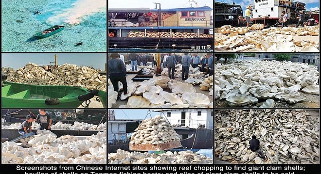 Điều này có lý vì hoạt động cải tạo trái phép đá Chữ Thập, Subi và Vành Khăn thành đảo nhân tạo rồi xây dựng cơ sở hạ tầng trên đó trong năm 2014 và 2015 tiếp nối ngay sau khi hàng loạt tàu cá đến đó như thể ngư dân Trung Quốc đã được bật đèn xanh để khai thác loài sò quý hiếm này trước khi các rạn san hô bị chôn vĩnh viễn dưới hàng triệu tấn cát.