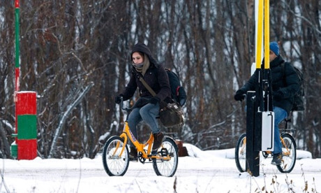 Hai người di cư đang vượt qua cửa khẩu Storskog giữa trời lạnh giá bằng xe đạp