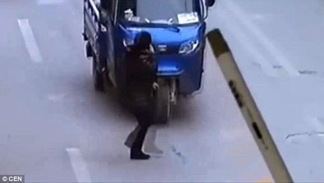 Sự việc xảy ra ở Trung Quốc khi một người qua đường đã quá xui xẻo. Người này bị tai nạn và chết thảm vì bị xe ba bánh đâm và kéo lê trên đường. Lý do tưởng như chỉ có trong phim khi tài xế của chiếc xe xao nhãng vì một phụ nữ mặc váy ngắn.