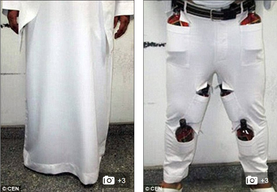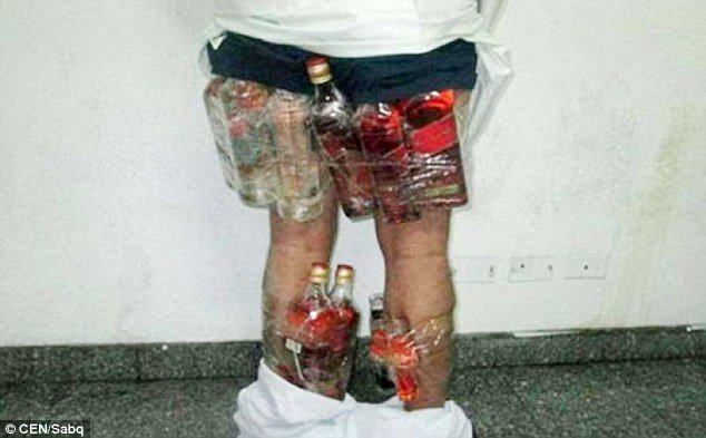 Rượu là một mặt hàng cấm nhập vào Ả Rập Saudi. Để qua mặt hải quan Ả Rập Saudi, một người đàn ông đã quần vào chân và đùi tới 14 chai rượu ngoại. Nhìn dáng đi bất thường với phần dưới đồ sộ, anh ta đã không qua mắt được hải quan và đã bị bắt quả tang.
