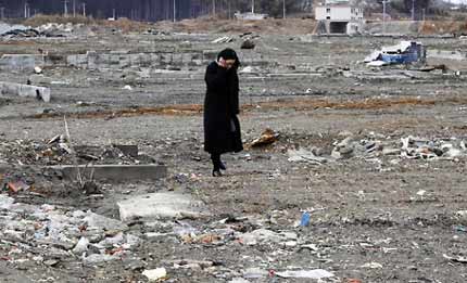 Một phụ nữ đứng trên đống đổ nát sau thảm họa động đất, sóng thần tấn công vào bờ biển đông bắc Nhật Bản tháng 3/2011. (Ảnh: AP)