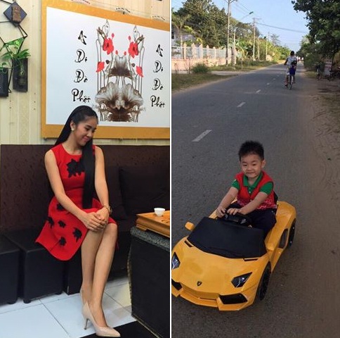 Mới đây nhất, trên trang cá nhân của mình, Lê Phương đăng tải hình ảnh cô diện chiếc đầm đỏ dễ thương, e ấp, nhẹ nhàng như thiếu nữ đôi mươi cùng con trai Cà Pháo bé bỏng đang chơi lái ô tô kèm dòng chú thích hài hước “Kiều nữ và Đại gia”.