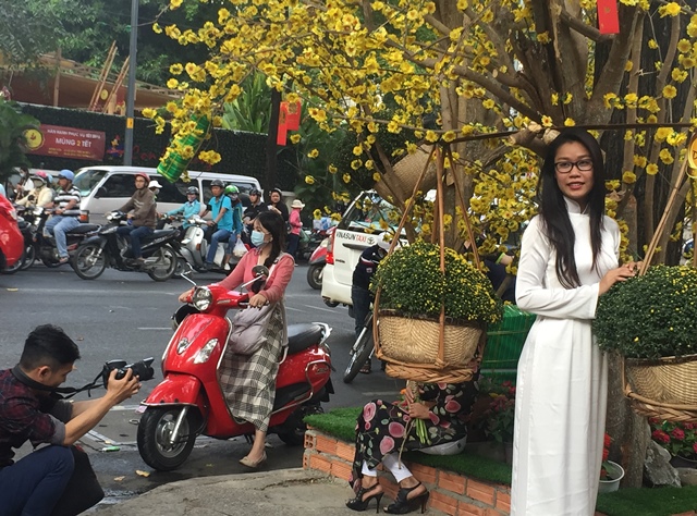 Tại TP.HCM, đặc biệt là khu vực đường mai và phố ông đồ ở khu vực Nhà văn hóa Thanh niên những ngày này đang vô cùng đông đúc và tấp nập người mua sắm, chơi tết. Trong đó, một lượng không nhỏ những thiếu nữ diện áo dài truyền thống tràn xuống phố để lưu lại những hình ảnh đáng nhớ. Hình ảnh này càng khiến không khí tết về gần hơn bao giờ hết.
