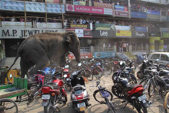 Hôm qua 10/2, một con voi rừng cái đã đi lạc vào một thị trấn nhỏ ở bang Tây Bengal - Ấn Độ. Một nơi xa lạ với môi trường sống khiến nó mất phương hướng và hoảng loạn. Nó chạy điên cuồng và húc đổ hàng loạt xe hơi, xe máy và xe đạp, khiến dân chúng sợ hãi.