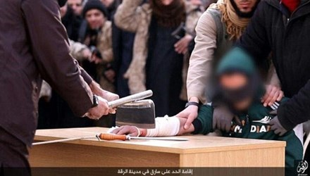 Một người đàn ông bị buộc tội ăn trộm đã bị phiên quân IS trừng phạt tàn bạo ngay giữa đám đông tại thành phố Raqqa, Syria. Người này bị kê tay trên bàn và đao phủ giơ dao chặt khiến người xem hãi hùng. Kèm theo bức ảnh là chú thích bằng tiếng Ả Rập “sự trừng phạt một tên trộm ở thành phố Raqqa”.