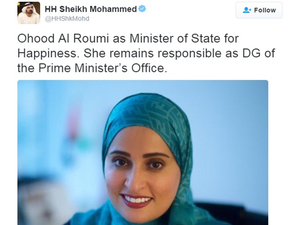Có lẽ chưa ai từng nghe nói tới chức vụ “bộ trưởng hạnh phúc”. Thế nhưng chức vụ này đã xuất hiện lần đầu tiên ở UAE. Người đầu tiên đảm nhiệm chức vụ lạ lùng này là bà Ohood Al Roumi hiện đang là người phụ trách văn phòng thủ tướng UAE.