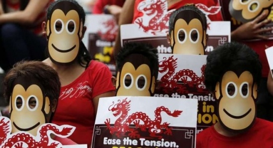 Người dân Philippines mang mặt nạ khỉ biểu tình trước văn phòng lãnh sự Trung Quốc ở thành phố Makati (Philippines) vào ngày 5-2-2016. (Ảnh: EPA)