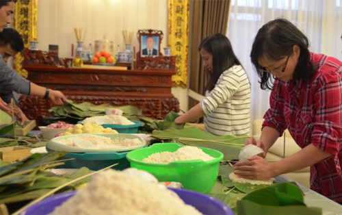 Cánh đàn ông xắn tay áo đun nước, mổ hai con lợn. Mấy chị em phụ nữ tỉ mỉ rửa sạch từng chiếc lá dong xanh. Một tốp người chung tay đãi gạo, vò đỗ. Những chiếc bánh chưng được gói cẩn thận, vuông vắn lần lượt ra đời trong không gian đầy tiếng cười nói và trò chuyện râm ran. Khung cảnh đầm ấm như tại một làng quê Việt Nam ngày Tết.