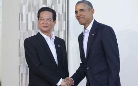 Tổng thống Mỹ Barack Obama bắt tay Thủ tướng Việt Nam Nguyễn Tấn Dũng tại hội nghị thượng đỉnh Mỹ-ASEAN tại Sunnylands sáng 16/2 theo giờ Việt Nam - Ảnh: AP/Washington Times.