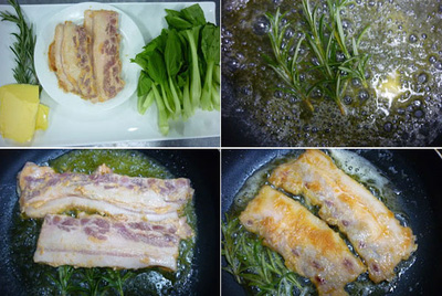 Đầu tiên, bạn ướp các lát thịt với gia vị gồm nước ép từ hành tây, cần tây cùng với tỏi băm, một chút muối để ngấm gia vị. Tiếp theo, làm nóng chảo cho bơ vào làm tan chảy bơ, cho hương thảo tươi vào chiên. Tiếp đến, bạn cho các lát thịt lên trên cây hương thảo và rán vàng hai mặt.