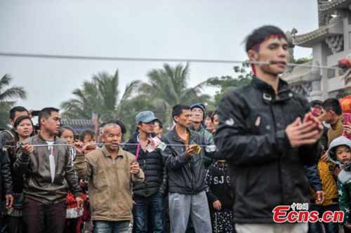 Vietbf.com - Người Trung Quốc biểu diễn xiên que qua miệng nổi bật nhất với ngoài xiên que qua miệng, lễ hội còn có màn múa sư tử, múa rồng và rước tượng thánh tại một ngôi đền ở huyện Định An, tỉnh Hải Nam, Trung Quốc trong lễ hội đầu năm.