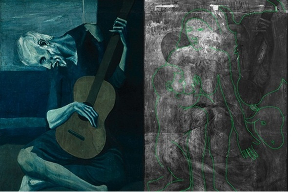 Bằng việc chụp X-quang, các nhà nghiên cứu phát hiện ra rằng bức họa “Nhạc công guitar già” của danh họa Pablo Picasso ẩn giấu một gương mặt lờ mờ ở phần cổ của người nhạc công. Sau khi tìm hiểu kĩ hơn, họ kết luận đây là hình ảnh của một người phụ nữ đang bế con, kề bên một con bò và con cừu.
