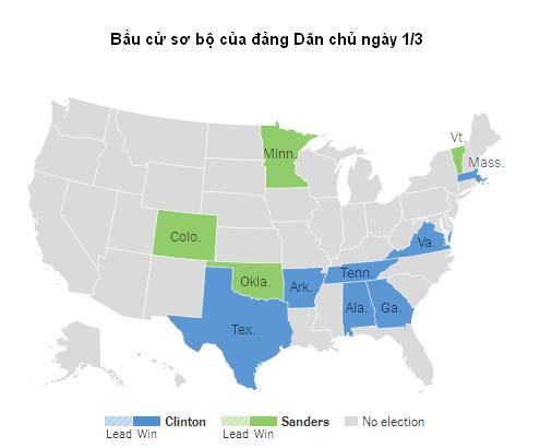 Theo kết quả khảo sát cử tri sau khi bỏ phiếu, bà Clinton đã chiến thắng tại 7 bang, gồm Georgia, Virginia, Alabama, Tennessee, Arkansas, Texas và Massachusetts, trong khi đối thủ của bà là Thượng nghị sỹ Sanders thắng tại 4 bang Vermont, Oklahoma, Colorado và Minnesota.