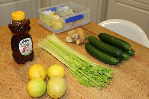 Những nguyên liệu để chế biến đồ uống đơn giản, dễ chuẩn bị, có nguồn gốc thiên nhiên. Ông bầu Dũng Taylor chia sẻ, nguyên liệu chuẩn bị bao gồm: 120 ml nước, nửa quả chanh nguyên vỏ, một thìa cà phê gừng tươi thái nhỏ, một quả dưa chuột nguyên vỏ, nắm cần tây, thìa cà phê mật ong. Xay nhuyễn trong vòng 30 giây để các nguyên liệu hòa tan thành nước.