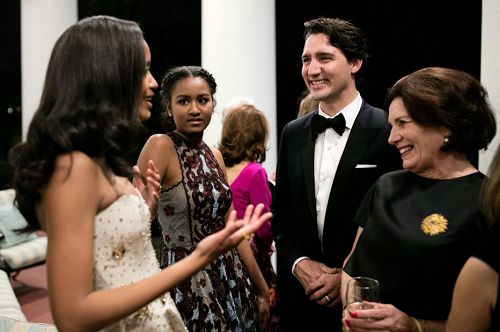 Bản thân ông Trudeau cũng là con trai một nhà lãnh đạo thế giới. Cha ông đã làm Thủ tướng Canada từ lúc con trai mới chào đời cho đến năm 8 tuổi. Trong bữa tiệc, ông Trudeau bày tỏ sự ngưỡng mộ đặc biệt đối với hai thiếu nữ.