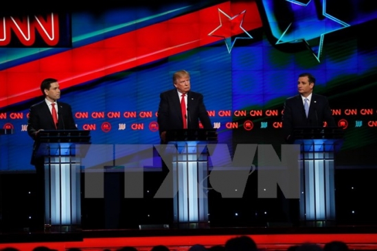 Trong ảnh (từ trái sang phải): Thượng nghị sỹ Marco Rubio, tỷ phú Donald Trump và Thượng nghị sỹ Ted Cruz tại buổi tranh luận.