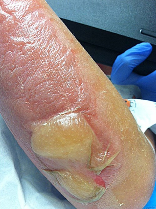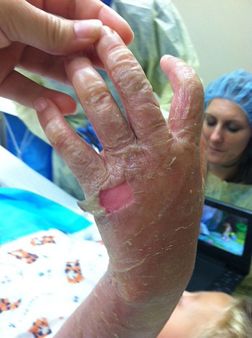 Bàn tay một cô bé bị phồng rộp, bong tróc đáng sợ. (Ảnh: Internet)