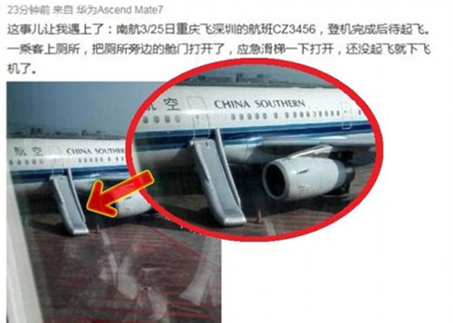 Hồi đầu tháng này, một khách nam trên chuyến bay của hãng China Southern Airlines đã mở cửa thoát hiểm ngay trước khi máy bay cất cánh ở Thành Đô, tỉnh Tứ Xuyên, vì muốn "hít thở ít không khí trong lành".
