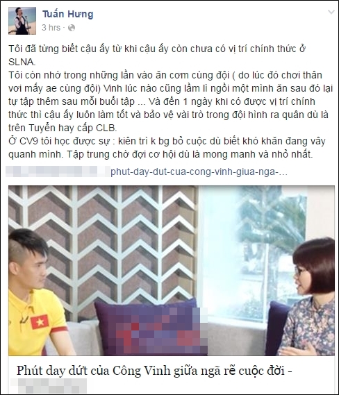 Mặc dù hơn đàn em tới 7 tuổi nhưng mới đây, giọng ca “Nắm lấy tay anh” bất ngờ đăng tải 1 dòng trạng thái thể hiện sự ngưỡng mộ CV9. Chứng kiến sự thành công của Công Vinh ở thời điểm hiện tại khiến Tuấn Hưng chợt nhớ lại những kỉ niệm về chân sút xứ Nghệ ở quá khứ. Bắt gặp 1 bài phỏng vấn chia sẻ về những cái được – mất của Công Vinh với nghiệp sân cỏ, Tuấn Hưng đã chia sẻ về ấn tượng của anh với Công Vinh hồi chưa có vị trí nhất định trong làng thể thao.
