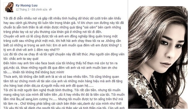 Dù đã nhiều lần nhận được những lời mời gọi khiếm nhã từ những vị "đại gia" nhưng đây là lần đầu tiên Lưu Kỳ Hương thể hiện sự bức xúc trên trang cá nhân của mình