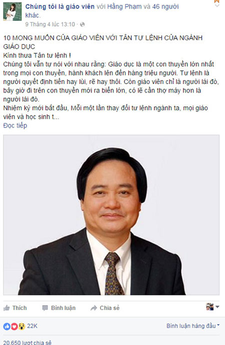 Thông tin ngành Giáo dục vừa thay đổi Bộ trưởng đã khiến cho hầu hết giáo viên cả nước vừa mừng, vừa lo. Theo đó, giáo viên vui vì lại có thêm mong đợi tương lai mới, phát triển mới cho ngành giáo dục nhưng lại lo vì không biết sẽ thay đổi thế nào. Xuất phát từ dòng cảm xúc này, trên trang fanpage Facebook “Chúng tôi là giáo viên” đã chia sẻ 10 mong muốn gửi đến tân tư lệnh ngành Giáo dục – Bộ trưởng Phùng Xuân Nhạ.
