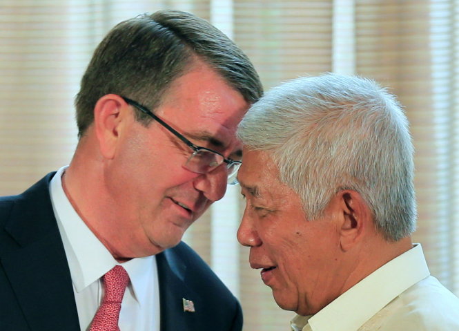 Bộ trưởng Quốc phòng Mỹ Ashton Carter (trái) và Bộ trưởng Quốc phòng Philippines Voltaire Gazmin tại buổi họp báo ở phủ tổng thống (Manila) ngày 14-4 - Ảnh: Reuters