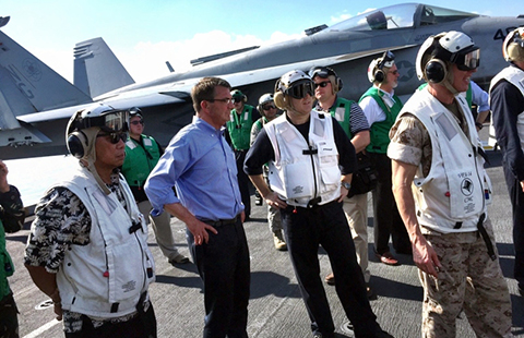 Bộ trưởng Quốc phòng Mỹ Ashton Carter trên tàu sân bay USS John C. Stennis chiều 15-4.
