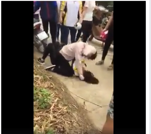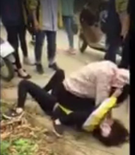 Người mặc áo đồng phục trường chuyên bị một nữ sinh khác đè lên, túm tóc, liên tục đập đầu xuống mặt đường. Một số thanh niên đứng xung quanh la hét, cổ động "đập chết nó đi".
