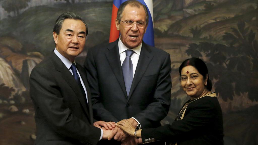 Ba ngoại trưởng Vương Nghị (Trung Quốc), Sergei Lavrov (Nga) và Sushma Swaraj (Ấn Độ) chụp ảnh chung trước cuộc họp thường niên tại Matxcơva, ngày 18/04/2016.