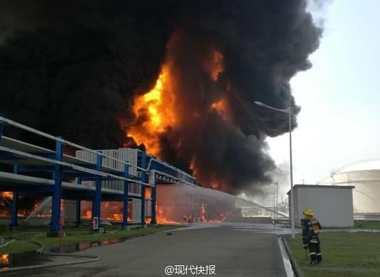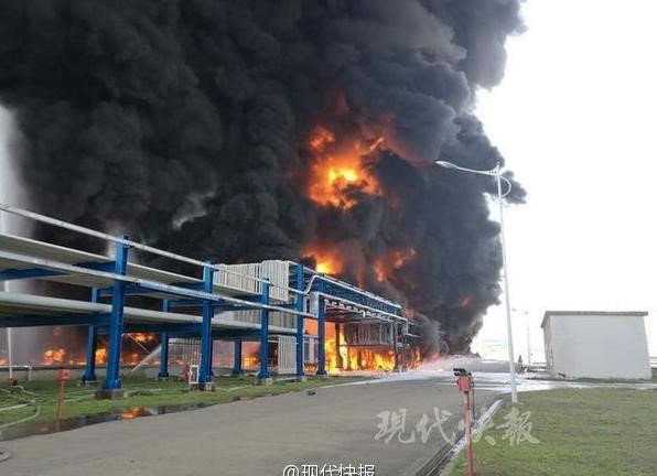 Đài truyền hình trung ương Trung Quốc CCTV phát hình ảnh một đám cháy lớn kèm theo khói đen bốc cao hàng trăm mét lên không trung. Ngọn lửa từ vụ nổ bốc cao tới 30 m. Nhân chứng của vụ việc cho biết, họ nghe thấy hai tiếng nổ phát ra từ khu vực hiện trường.