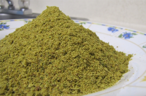 Bạn nghiền lá xoài thành bột rồi cất đi để dùng dần.