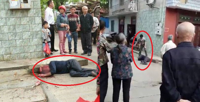 Ông Khâu bị con trai đánh đến mức đầu bê bết máu, nằm vật ra đường trước khi được đưa vào bệnh viện cấp cứu.