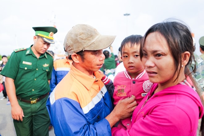 Một trong số 34 ngư dân bị nạn hạnh phúc vì đã may mắn thoát chết, gặp lại vợ con. Ảnh: Nguyên Vũ.
