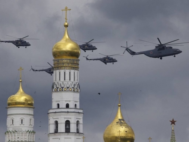 Trực thăng quân sự Nga bay trên Tháp chuông Ivan Vĩ đại và nóc Điện Kremlin trong buổi tập duyệt cho lễ diễu binh mừng 71 năm ngày chiến thắng Phát xít tại thủ đô Moscow hôm 5/5.
