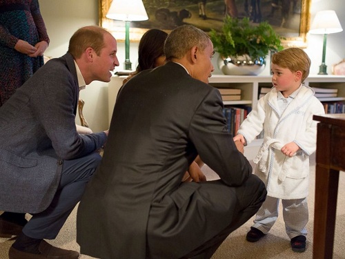 Hoàng tử bé George gặp vợ chồng Tổng thống Obama trong điện Kensington. Ảnh: AP