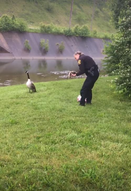 Trong khi nữ cảnh sát ôm lấy ngỗng con để tháo bong bóng, ngỗng mẹ kêu lên từng hồi. Vừa được giải thoát, ngỗng con liền chạy lại phía đàn với ngỗng mẹ chạy theo sau.