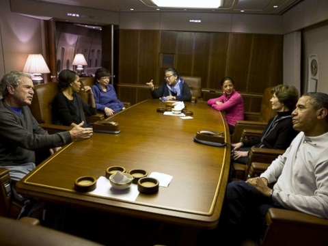 Gia đình Tổng thống Obama, gia đình cựu tổng thống George W. Bush và cựu đệ nhất phu nhân Hillary Clinton hôm qua cùng có mặt trên chuyên cơ Air Force One.