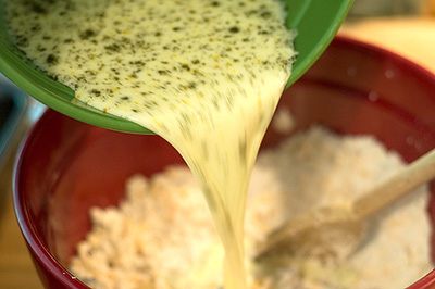 Sữa, dầu thực vật, trứng, hạt thì là, bột mù tạt khuấy đều, sau đó đổ vào âu bột, trộn đều lần nữa bằng phới gỗ. Đảm bảo rằng bột đã được đánh mịn, không còn bị vón cục.