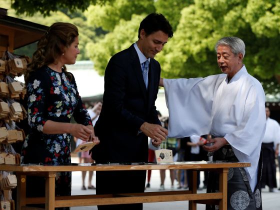 Thủ tướng Canada Justin Trudeau cùng vợ thăm đền Meiji ở Nhật Bản. (Ảnh: AFP)