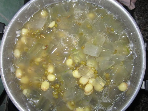 Bước quan trọng cuối cùng, bạn cho 1 lít nước lạnh và sườn vào nồi con cơm điện, ninh cho đến khi thấy sườn có vẻ mềm ra rồi cho thêm đậu xanh, bí vào hầm đến khi chín mềm, nêm nếm muối, hạt nêm, đường, tiêu cho vừa ăn.