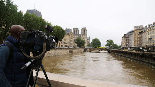 Phóng viên truyền hình tác nghiệp tại khu vực lũ lụt ở Paris